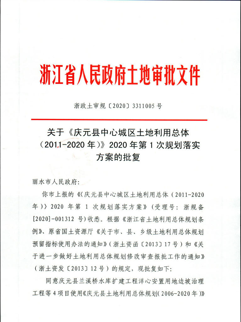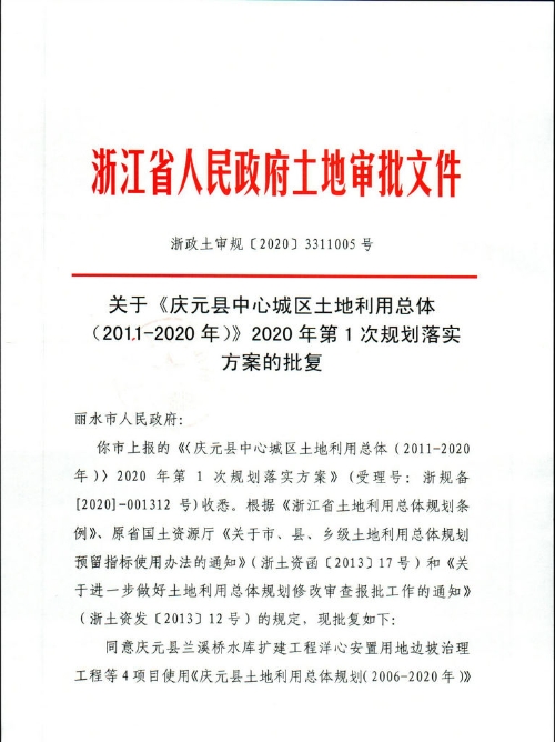 浙江省人民政府關于《慶元縣中心城區土地利用總體規劃(2011-2020年)》2020年第1次規劃落實方案的批復