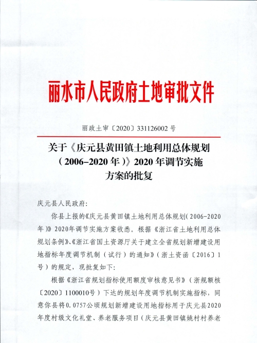 麗水市人民政府關(guān)于《慶元縣黃田鎮(zhèn)土地利用總體規(guī)劃(2006-2020年)》2020年調(diào)節(jié)實(shí)施方案的批復(fù)