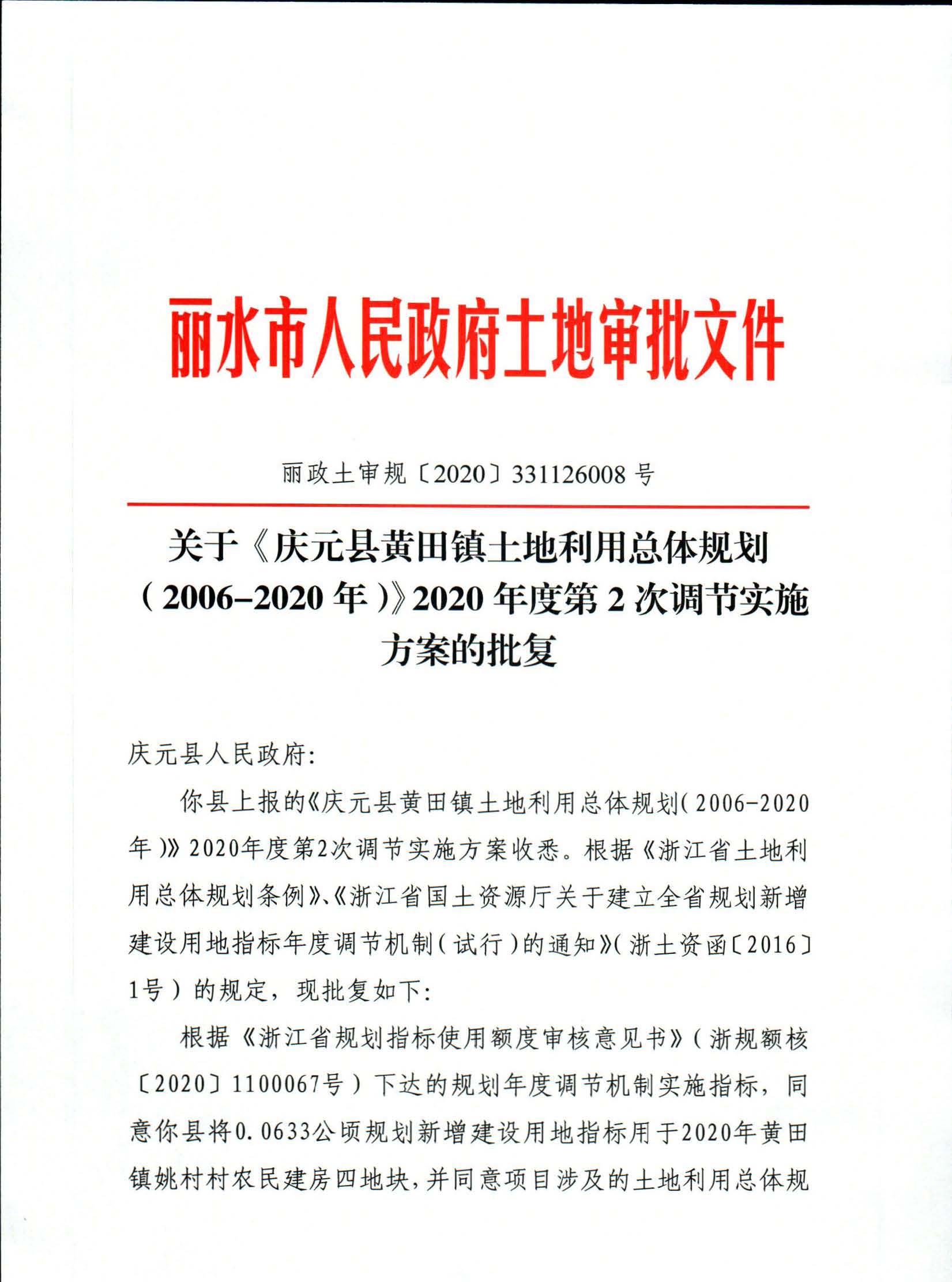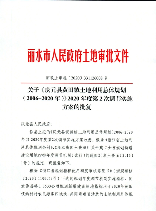 麗水市人民政府關于《慶元縣黃田鎮土地利用總體規劃(2006-2020年)》2020年度第2次調節實施方案的批復