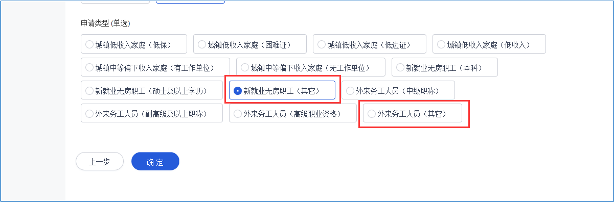 “申請(qǐng)類(lèi)型”申請(qǐng)新就業(yè)的,統(tǒng)一選擇“新就業(yè)無(wú)房職工(其它)”;申請(qǐng)外來(lái)務(wù)工的,統(tǒng)一選擇“外來(lái)務(wù)工人員(其它)。