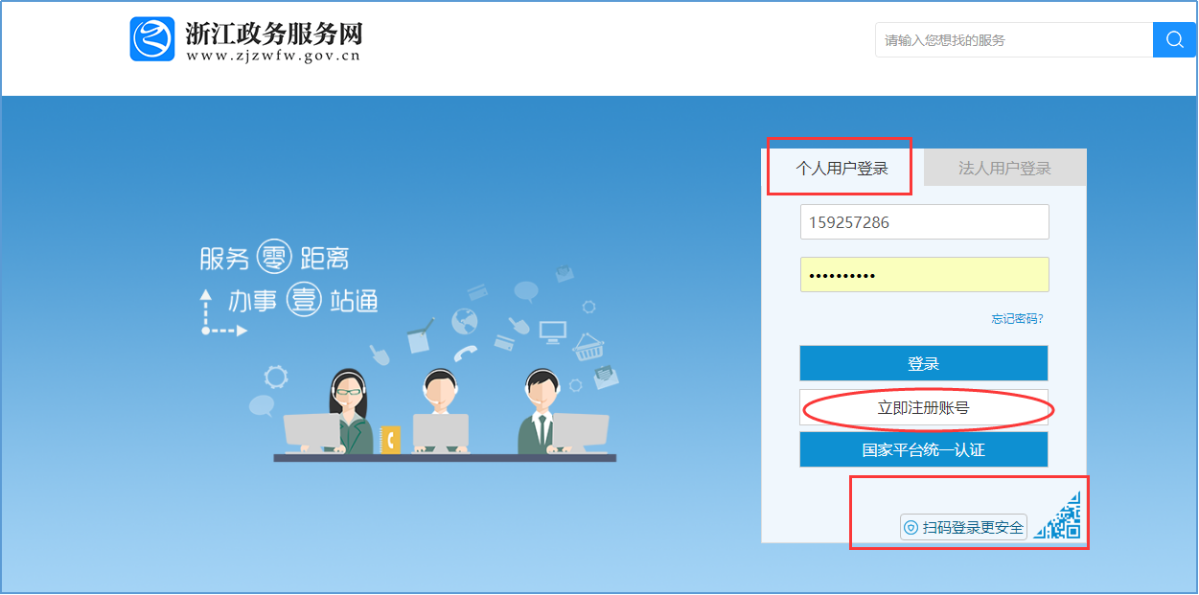 第5步:在“個(gè)人用戶(hù)登錄”中,輸入賬號(hào)、密碼進(jìn)行登錄,或點(diǎn)擊“掃碼登錄更安全”,用浙里辦APP掃碼登錄。