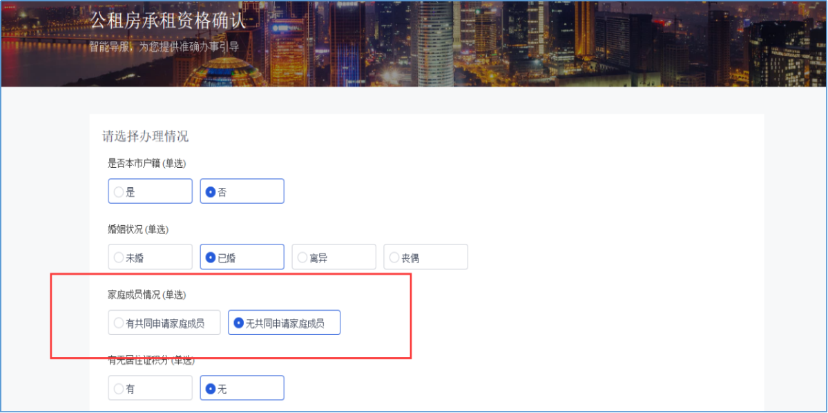 第8步:根據(jù)自身情況進(jìn)行選擇。其中,“家庭成員情況”:未婚的,或者僅夫妻二人申請(qǐng)公租房的,家庭中沒(méi)有未成年子女的,或者未成年子女生活在外地,不與夫妻二人生活在一起的,選擇“無(wú)共同申請(qǐng)家庭成員”。
