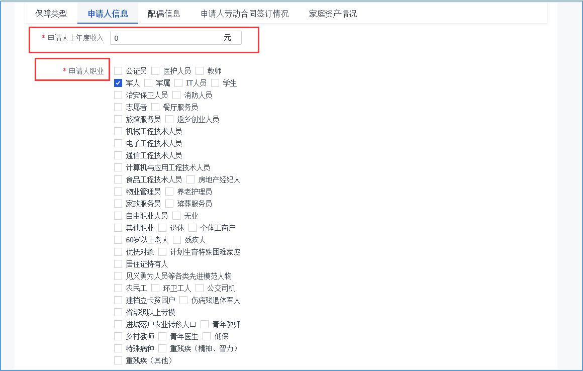 填寫(xiě)“上年度收入情況”,勾選“申請(qǐng)人職業(yè)”。