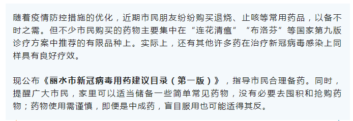 請合理備藥!麗水市公布新冠病毒用藥建議目錄(第一版)