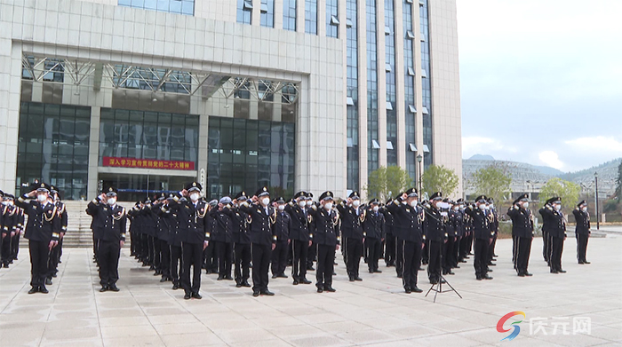 儀式現場,全體民警精神抖擻、整齊列隊。上午9時,伴隨著指揮員嘹亮的口令,護旗手護衛著中國人民警察警旗,邁著鏗鏘有力的步伐走向升旗臺。在雄壯激昂、催人奮進的《中國人民警察警歌》中,升旗手揮臂展旗,警旗冉冉升起。全體民警莊嚴敬禮,共同祝愿偉大祖國繁榮昌盛、人民幸福安康。