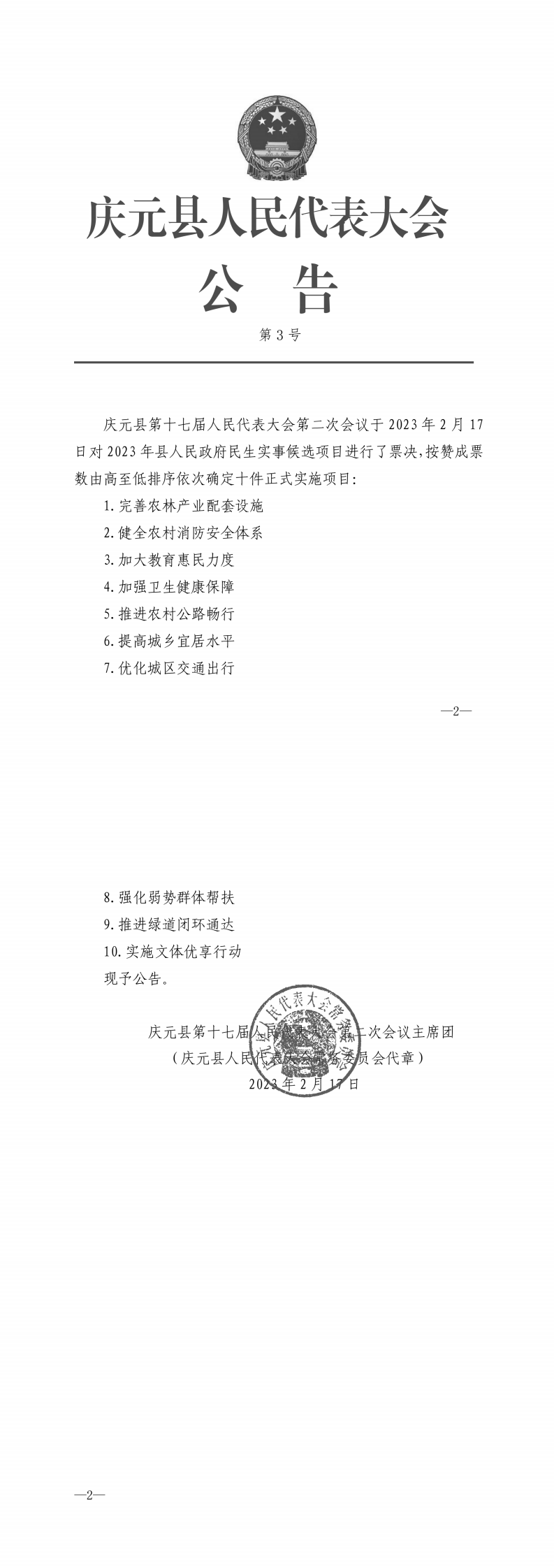 關于2023年慶元縣人民政府民生實事候選項目票決公告