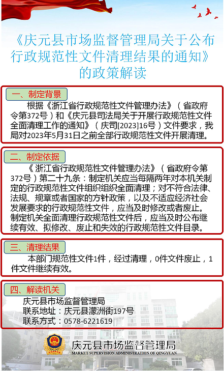 根據《浙江省行政規范性文件管理辦法》(省政府令第372號)和《慶元縣司法局關于開展行政規范性文件全面清理工作的通知》(慶司[2023]16號)文件要求,我局對2023年5月31日之前全部行政規范性文件開展清理。