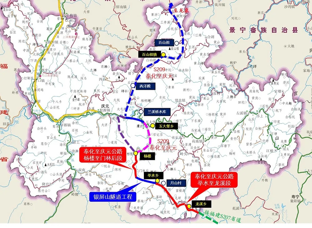 濛楊線農村公路改造提升工程是慶元連接福建的重要通道,是S209奉化至慶元公路慶元五大堡至龍溪段改建工程的重要組成部分,起點位于五大堡鄉黃田頭附近,順接現狀道路線位,沿濛楊線截彎取直、老路拓寬,經仙坑水庫、后奔村、半溪村,終點位于楊樓村尾,全長10.15公里,總投資約1.45億元。