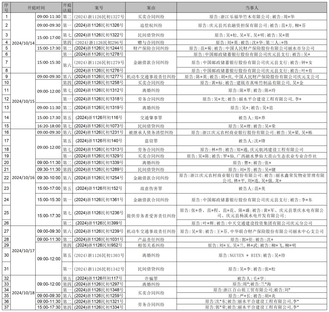 慶元法院本周將有37起案件開庭!涉及民間借貸、合同糾紛等…(附案件目錄)