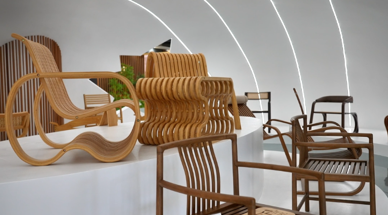 王戈:竹材與木材不同的一個很大特點是竹材能夠有很好的竹材柔韌性,包括現在三箭公司牽頭做的一些竹材彎曲柔韌性測試方法,它的特點是非常明顯的,可進行大曲率的彎曲,這樣能做出比較特色的產品。像展館中的椅子、桌子,包括一些工藝品、小型日用品,都可以充分發揮竹材彎曲性。據我了解,該展館應是國內第一家以曲面曲形竹家具為主題的展館,已走在行業的前列。