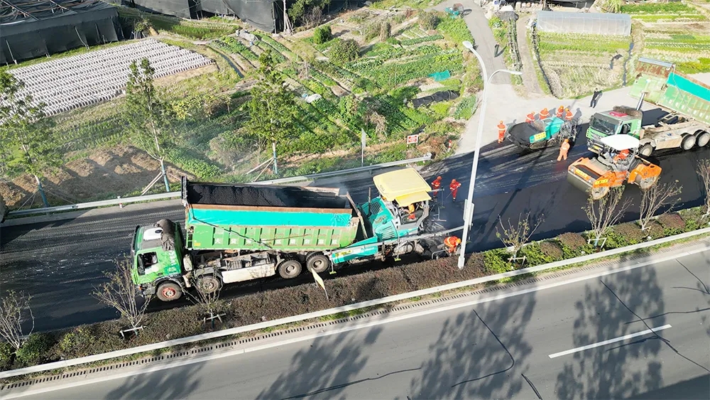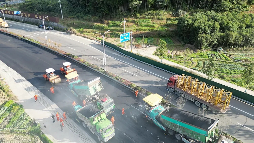 在慶元大道五都紅綠燈路口路段,乳化瀝青撒布車、裝載車、攤鋪機(jī)、鋼輪壓路機(jī)、膠輪壓路機(jī)等大型機(jī)械密切配合,養(yǎng)護(hù)工人們手持工具穿梭其中,現(xiàn)場一派繁忙景象。