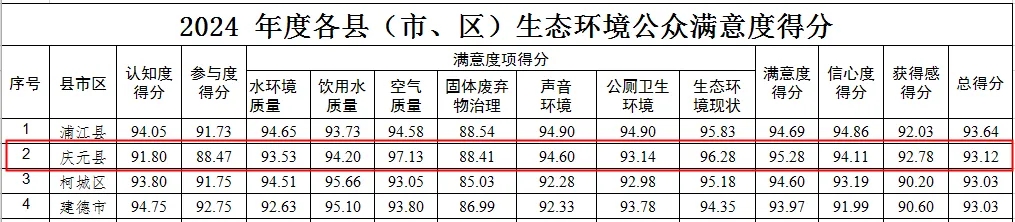 2024年度浙江省生態環境公眾滿意度調查 慶元全省第二、全市第一