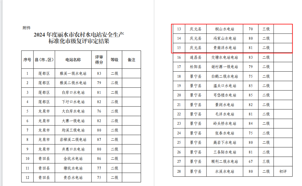 關(guān)于公布2024年度農(nóng)村水電站安全生產(chǎn)標(biāo)準(zhǔn)化市級(jí)復(fù)評(píng)審定結(jié)果