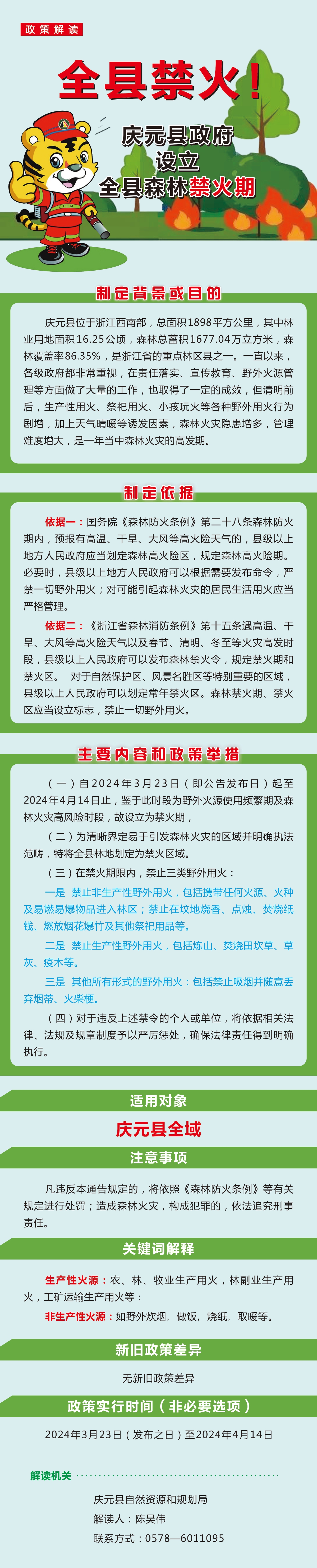 (一)自2024年3月23日(即公告發布日)起至2024年4月14日止,鑒于此時段為野外火源使用頻繁期及森林火災高風險時段,故設立為禁火期,