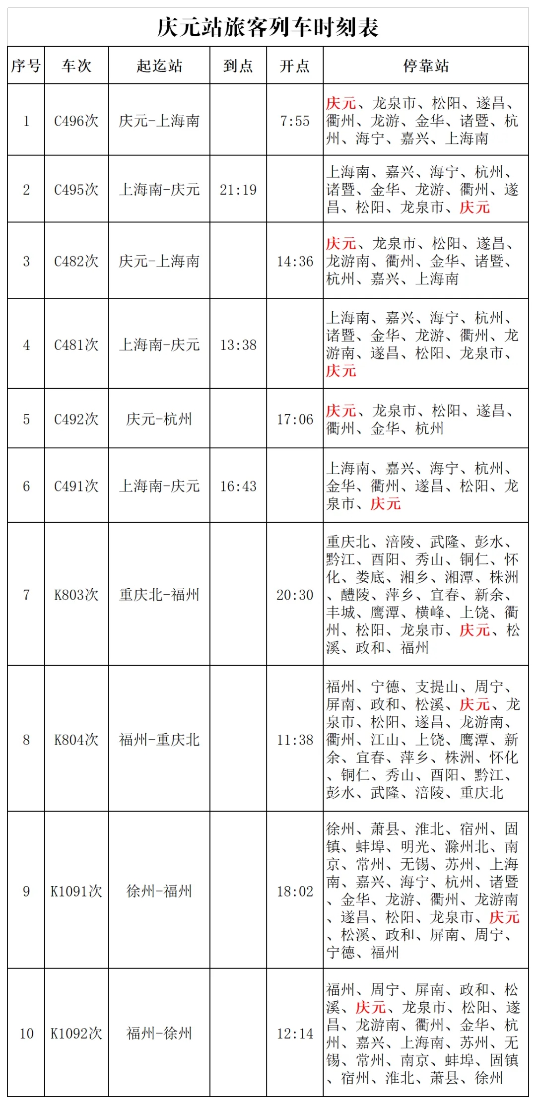 五一期間,始發(fā)和途經(jīng)慶元站的10趟列車全部開(kāi)行,慶元站旅客列車時(shí)刻表請(qǐng)查收。
