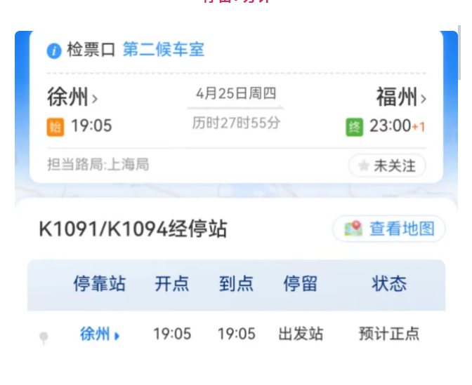 K1091次列車于19時(shí)05分從徐州站出發(fā),經(jīng)停29站,次日23時(shí)00分到福州站,歷時(shí)27小時(shí)55分,每日17時(shí)55分到慶元站,停留7分鐘。
