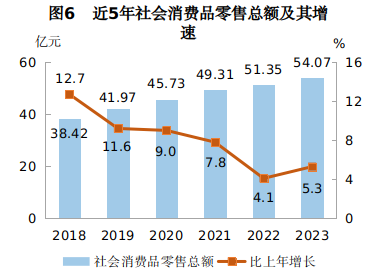 全年社會消費品零售總額54.07億元,比上年增長5.3%。其中,限額以上社會消費品零售總額7.87億元,增長6.3%。