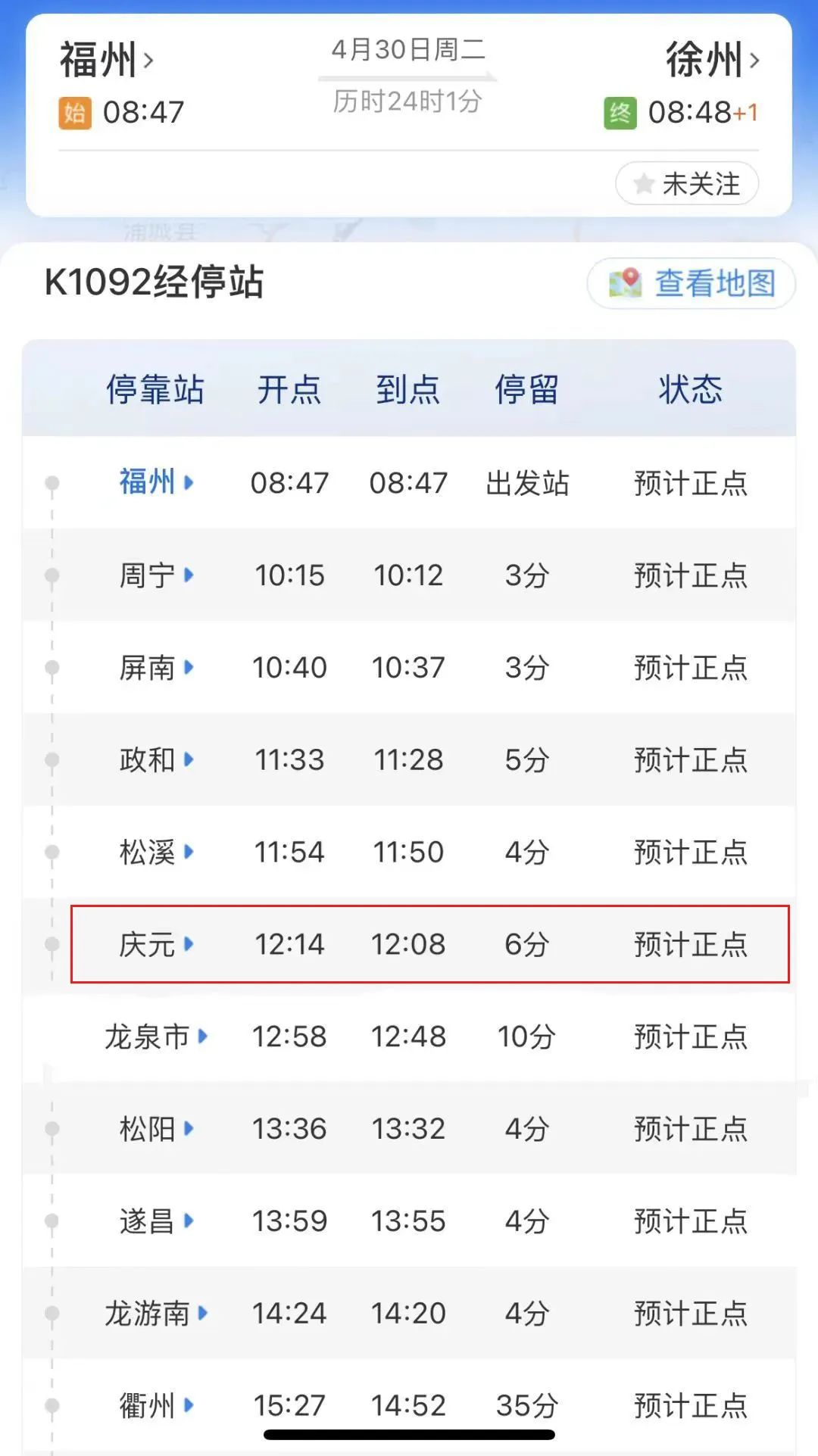 k1092次列車于8時47分從福州站出發,經停23站,次日8時48分到徐州站,歷時24小時1分,每日12時08分到慶元站,停留6分鐘。