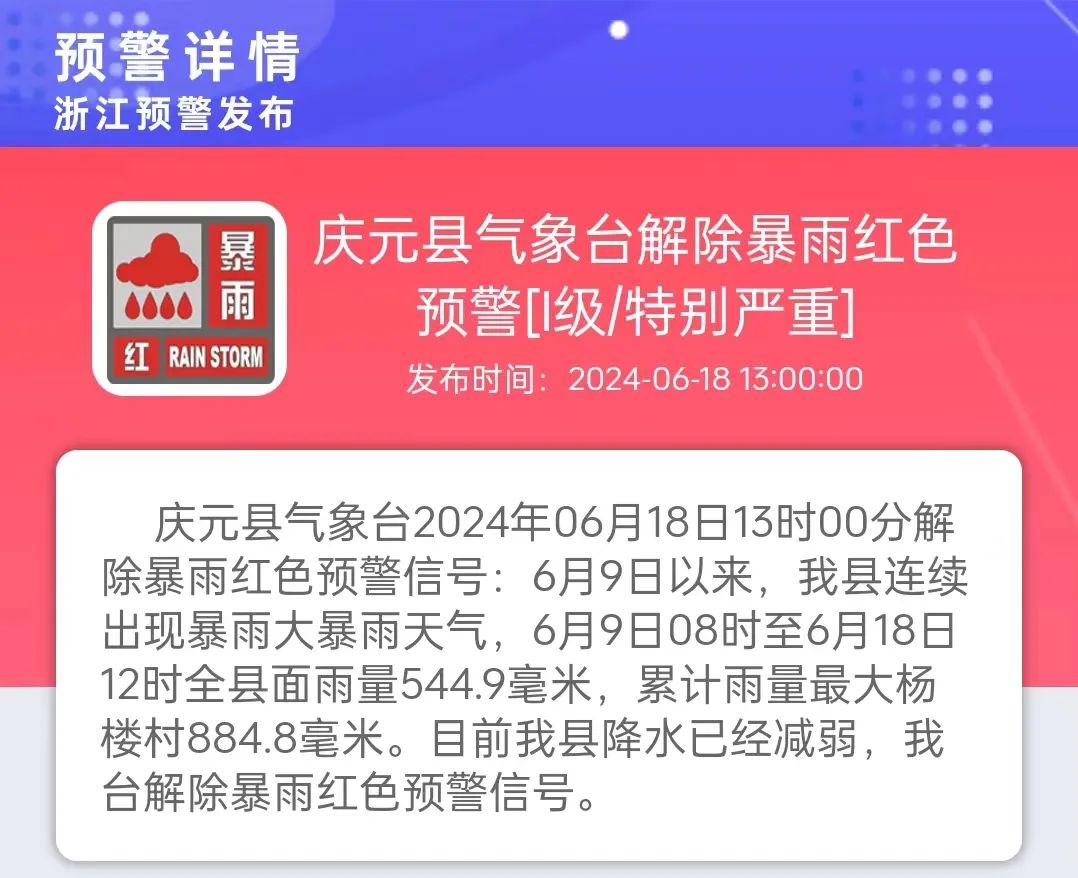久雨盼晴,讓人感到高興的是,6月18日下午起,隨著過去24小時雨量的減少,慶元已解除暴雨紅色預警信號。