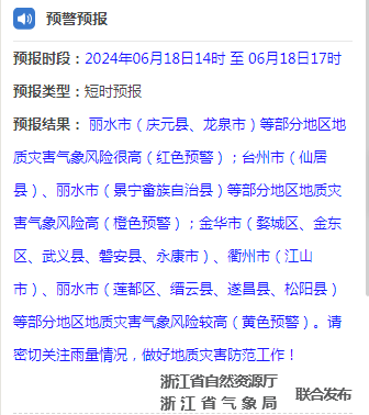 據氣象部門預報,今天夜里陰有陣雨;明天多云到陰,部分地區有陣雨,同時,6月18日14時起,慶元縣部分地區地質災害氣象風險很高(紅色預警),各地仍需高度警惕防范持續性強降水可能引發的塌方、滑坡、泥石流等次生災害,廣大市民切勿掉以輕心,遠離水邊、山邊等危險區域,確保自身安全。