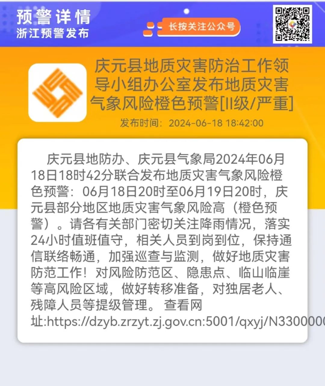 6月18日12時,慶元縣氣象臺解除暴雨紅色預警信號,18日18時42分,慶元縣地防辦將地質災害氣象風險調整為橙色預警。