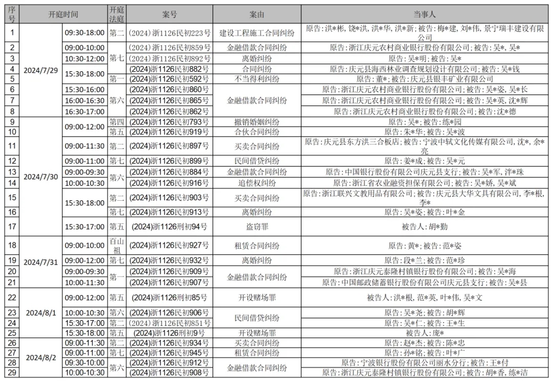 本周!慶元法院將開庭審理29起案件!附案件目錄!