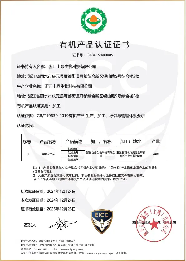 近日,經過鷹企服務(上海)有限公司嚴格檢測,浙江山鼎生物科技有限公司順利通過有機認證程序,榮獲有機產品認證證書。