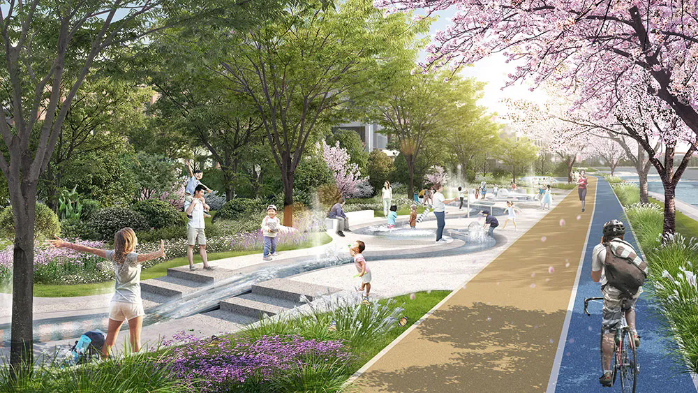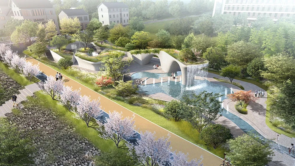 項(xiàng)目以“主客共享、老少皆宜”為目標(biāo),科學(xué)劃分三大功能區(qū):“超好玩”兒童戲水區(qū)。根據(jù)場(chǎng)地特色,因地制宜打造蜿蜒戲水道,串聯(lián)景觀水池、鏡面噴泉、霧森、趣味涌泉、水文化研學(xué)設(shè)施等節(jié)點(diǎn),設(shè)置兒童戲水、自然科普、研學(xué)教育等五大模塊,帶娃、休息兩不誤。“超健康”運(yùn)動(dòng)休閑區(qū)。依托岸坡地形改造攀巖墻、健身步道等設(shè)施,形成融合自然與運(yùn)動(dòng)的堤頂綠地公園。“超舒服”濱水休閑區(qū)。布局休憩座椅、遮陽廊架及文化展陳空間,營(yíng)造可駐足、可社交的慢生活場(chǎng)景。