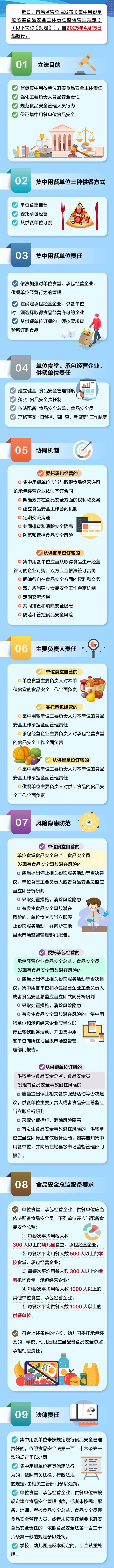 學校、托幼機構、養老機構、醫院、機關食堂等集中用餐單位食品安全是餐飲服務食品安全的重中之重,為督促集中用餐單位、單位食堂、承包經營企業、供餐單位落實食品安全主體責任,健全食品安全責任制,提高風險防控能力,維護群眾飲食安全,市場監管總局將集中用餐單位落實食品安全主體責任的規定單獨立法,制定出臺《規定》。