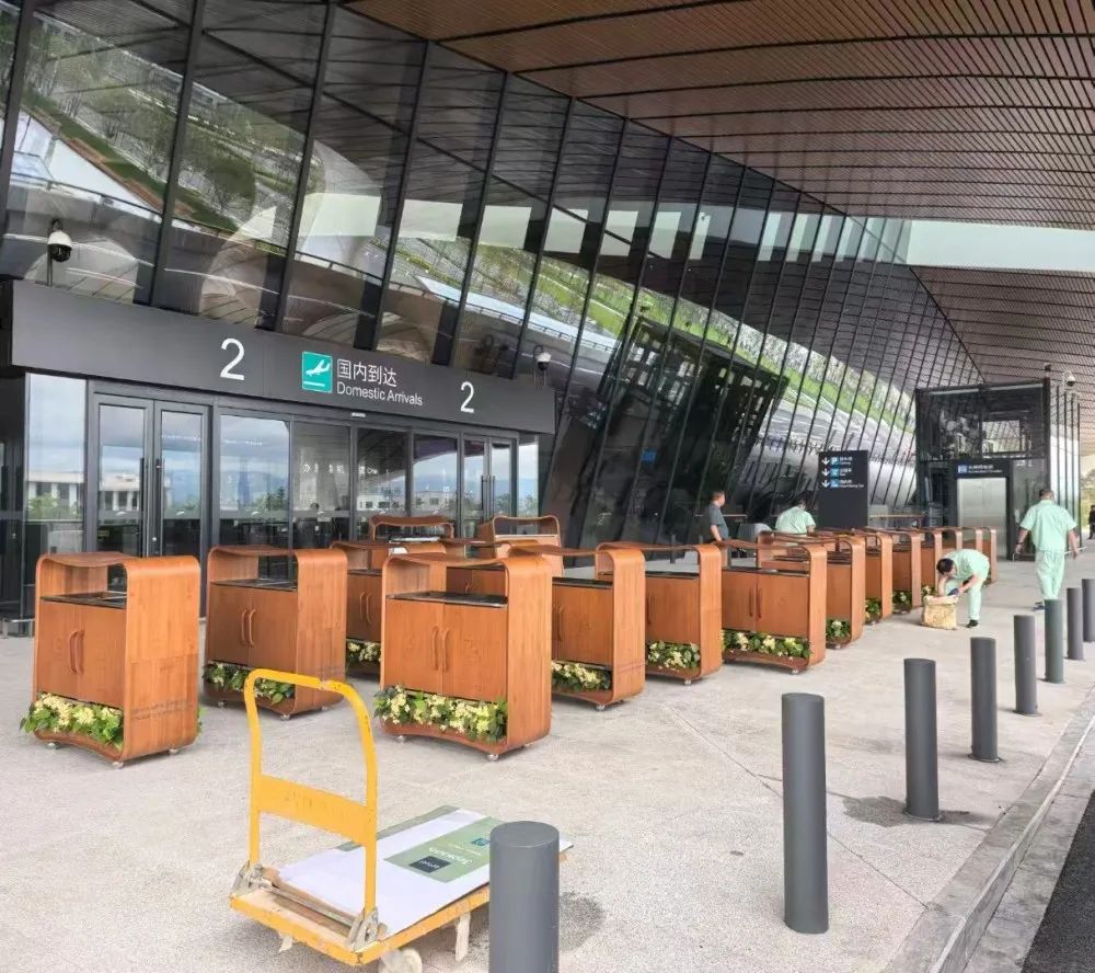 在候機大廳,造型獨特的曲竹垃圾桶格外醒目,棕褐色桶體以“騰飛機翼”為靈感,流暢線條與即將完成的拱門造型相呼應。