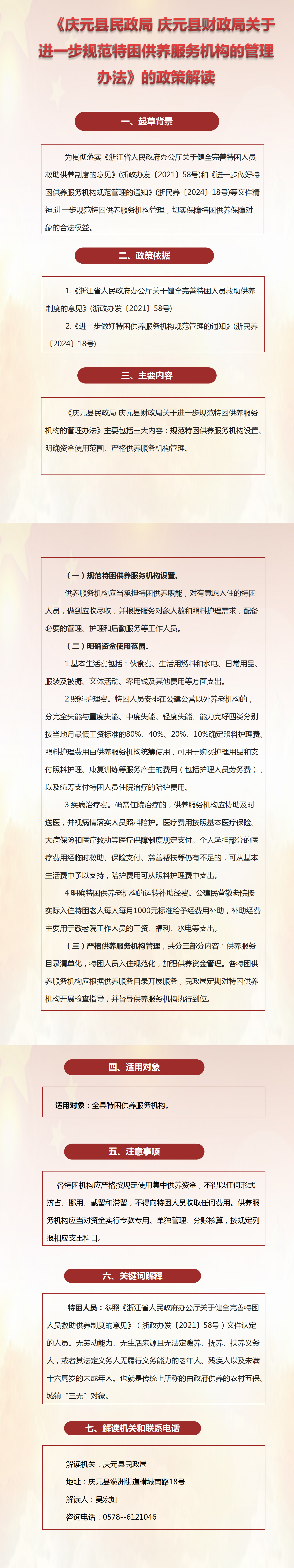 《慶元縣財政局關于進一步規范特困供養服務機構的管理辦法》主要包括三大內容:規范特困供養服務機構設置、明確資金使用范圍、嚴格供養服務機構管理。