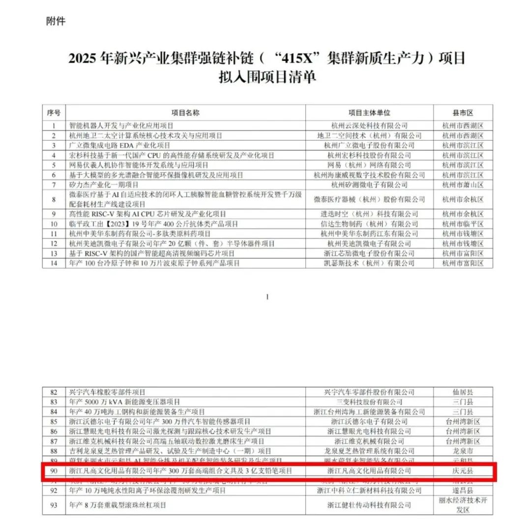 近日,浙江省經信廳公布了2025年新興產業集群強鏈補鏈(“415X”集群新質生產力)項目名單,慶元一項目入選,即浙江凡高文化用品有限公司年產300萬套組合文具及3億支鉛筆項目。