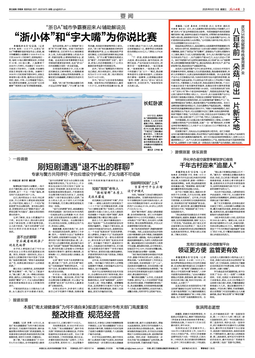 地處浙閩邊界的慶元,是我國野生大型真菌種質資源重要分布區。相傳800多年前,南宋菇農吳三公在長期與香菇打交道的過程中不懈探索,發明了“剁花法”和“驚蕈術”,使香菇生產從野生采集轉向人工栽培,解決了山區人民的溫飽問題。如今,慶元食用菌產業已成為當地支柱產業之一,全產業鏈年產值58億元,從業人員達4萬多人。面對市場飽和與行業競爭加劇的挑戰,慶元傳承“吳三公”創新精神,以科創賦能傳統食用菌產業,通過品種改良、數字化生產、新產品研發等手段,推動實現全產業鏈延伸升級。