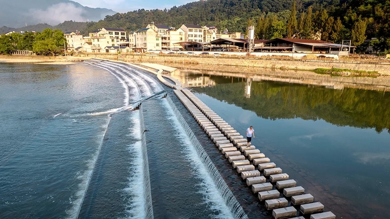 在水利文化遺產修繕上,上潭堰壩以廊橋造型為基礎,溢流面采用多級跌水設計,兼顧“中國廊橋之鄉”底蘊與功能美學統一,在保留灌溉供水功能的同時,滿足了群眾的親水需求,實現水利文化遺產活態傳承。