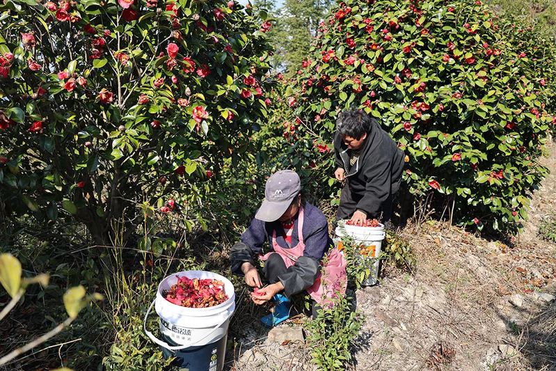 當前正值紅花油茶采花期,基地組織周邊留守群眾集中撿拾花瓣,每人每天工資可達150元左右。此次采花期持續(xù)一個多月,預計可帶動村民月均增收超過4000元。