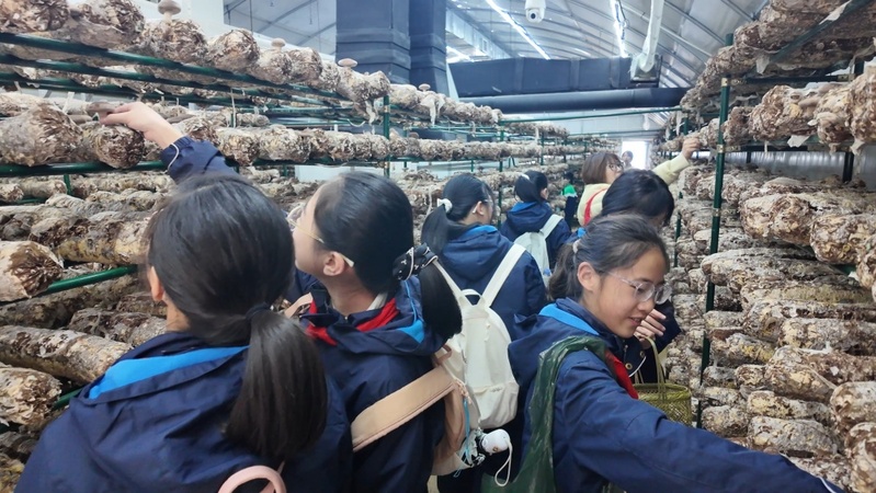 走進產(chǎn)業(yè)園,自動化菌棒生產(chǎn)線、智能溫控大棚、標準化培育車間依次呈現(xiàn)。從菌種培育、菌棒生產(chǎn),到菌絲生長、香菇采摘,再到加工保鮮,孩子們沿著產(chǎn)業(yè)鏈一路觀察、提問、記錄,詳細了解小小香菇從“培養(yǎng)基”到“餐桌美味”的完整過程。