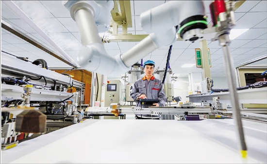 圖為工人操控全自動膜材料生產線。 通訊員 譚云俸 攝